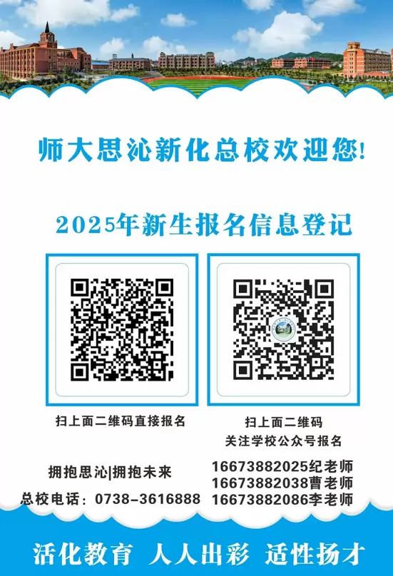 到学校招生办现场咨询登记报名,电话报名,扫学校老师出示的二维码报名,关注学校微信公众号或登录学校网站报名,七年级新生需要在新化县阳光招生网站登记资料。