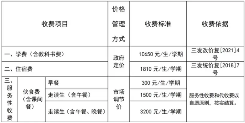 学杂费10650元/生/学期;住宿费及伙食费相关收费标准见下表⤵