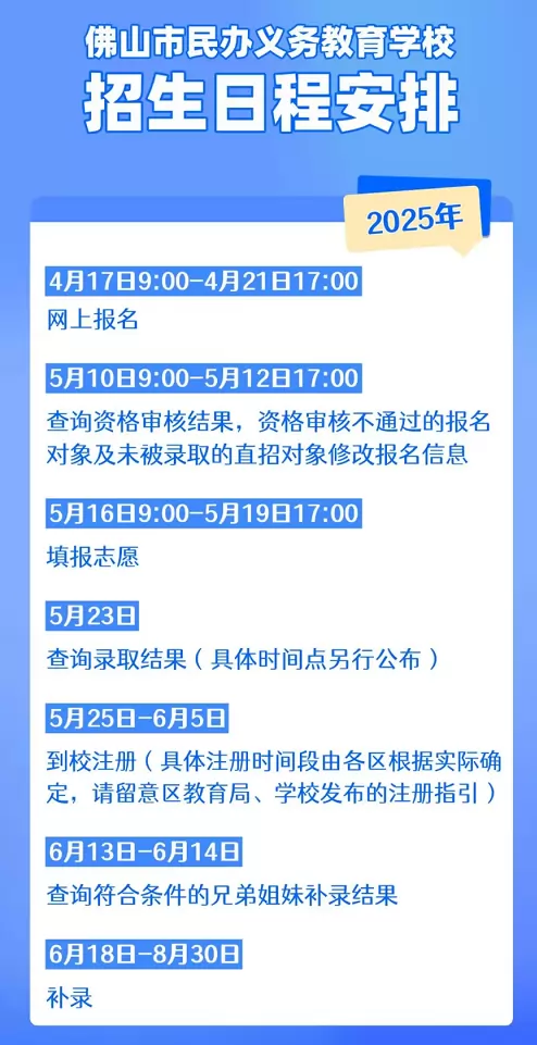 《顺德区2025年民办义务教育学校招生工作实施细则》公布统一注册时间为2025年5月24日至5月30日(具体时间以各学校收到市教育局下发的注册名单后通知为准)。