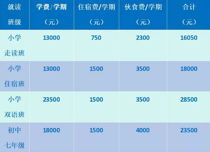 小学普通班学费13000元/学期;小学双语班学费23500元/学期;初中学费18000元/学期;住宿费、伙食费收费说明情况参见下表⤵