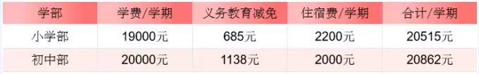 小学部学费19000元/学期;初中学费20000元/学期;更多收费说明情况参见下表👇