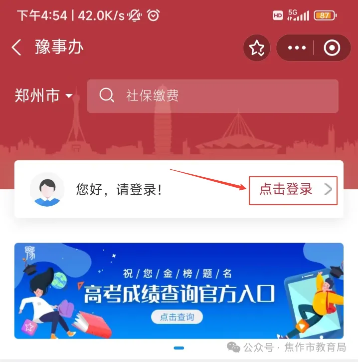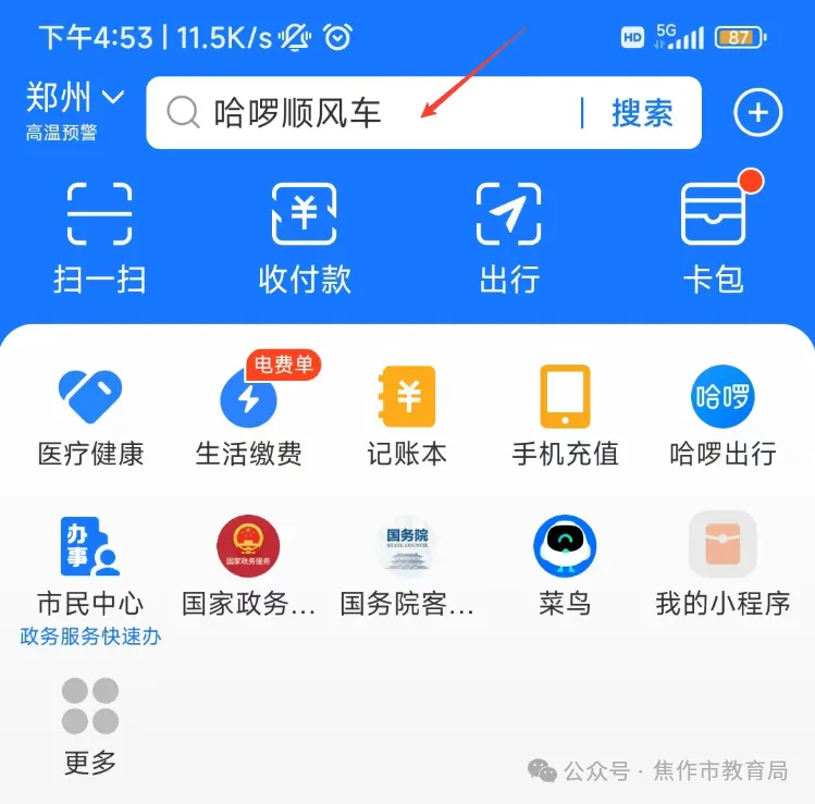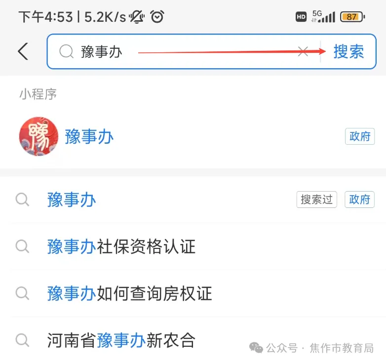 在搜索框中输入“豫事办”;点击“搜索”按钮。