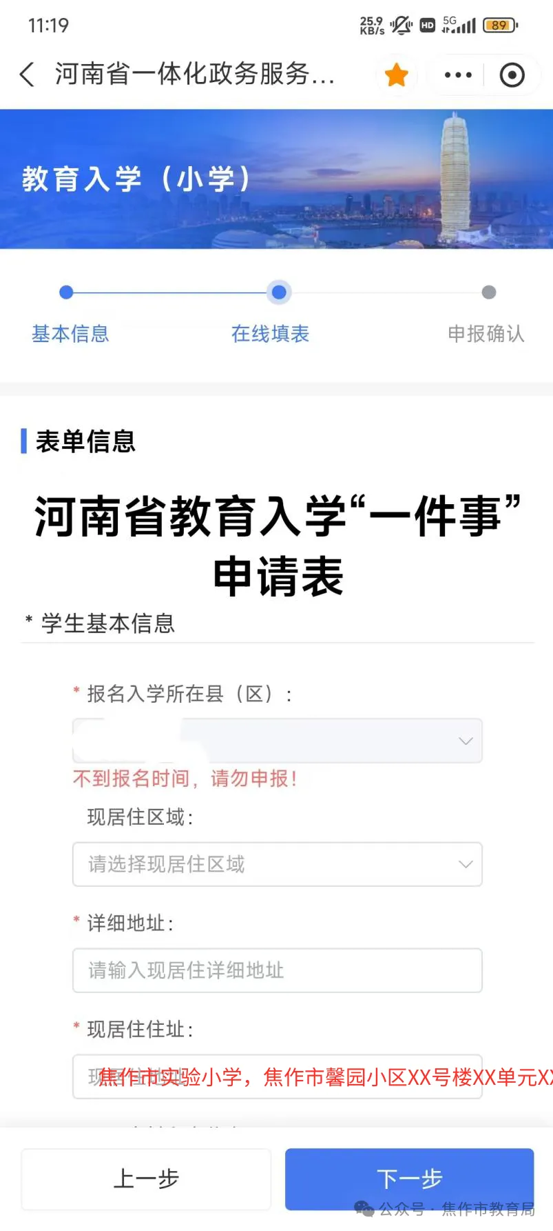 1.9 在线填表 点击下一步后,进入在线填表界面,填写情形选择后需要填写的表单信息,请在填写“现居住住址”时,一并填写申报学校,即学校+住址,如:焦作市实验小学,焦作市馨园小区XX号楼XX单元XX号(见下图)。填写完毕后点击“下一步”。